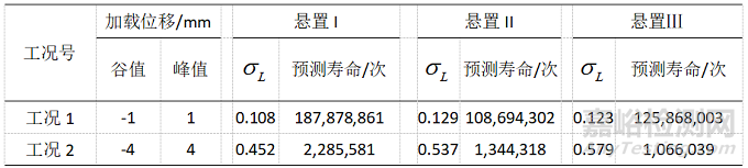 在工況2時,三種不同結(jié)構(gòu)的橡膠懸置中,懸置I的預測壽命最大,懸置III的預測壽命最小。