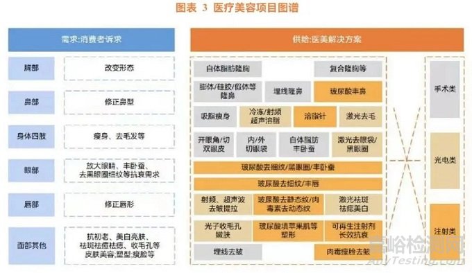 隨著“顏值經(jīng)濟(jì)”的興起,人們對美容的需求也在不斷的提高,不斷豐富的醫(yī)美項(xiàng)目為求美者細(xì)分化需求提供不同解決方案。醫(yī)療美容項(xiàng)目圖譜從兩個(gè)維度展開,一是從消費(fèi)者的需求出發(fā),每個(gè)人從頭到腳或多或少都存在一些不同的需求。二是醫(yī)美供給端所能提供的解決方案看,針對不同年齡、人群、需求的差異,技術(shù)路徑選擇存在一定的分化。消費(fèi)者對面部、身體及四肢的醫(yī)療美容訴求可通過手術(shù)、能量源項(xiàng)目以及注射類項(xiàng)目進(jìn)行改善,同一訴求可擁有多種解決方案,進(jìn)一步為求美者更為細(xì)分的需求提供多樣化選擇。