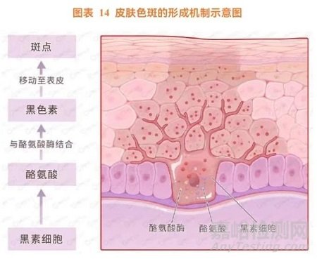 色斑又叫色素增加性皮膚疾病,形成較為復(fù)雜,可能與遺傳、內(nèi)分泌、營養(yǎng)與代謝、化學(xué)和藥物等因素有關(guān),但與黑色素有著密切相關(guān)性。黑色素是由黑素細(xì)胞產(chǎn)生,細(xì)胞內(nèi)有酪氨酸和酪氨酸酶,兩者結(jié)合通過復(fù)雜的氧化反應(yīng)變成黑色素。黑色素形成后會隨著新陳代謝逐漸上移至角質(zhì)層,從而形成色斑。另外,有部分黑色素會移向真皮淺層,或被吞噬細(xì)胞所吞噬降解。黑素細(xì)胞多分布于基底細(xì)胞之間,但也有少量位于表皮、真皮或真皮與表皮的交界處,成為色素痣或黑痣。影響黑色素形成的因素有很多,除了細(xì)胞自身因素以外,還有外界因素,主要是來自紫外線 UV 的照射。在紫外線的照射下能夠激活黑色素細(xì)胞,活化酪氨酸酶,促進(jìn)黑色素產(chǎn)生,加速皮膚色素沉著,從而導(dǎo)致角質(zhì)層的色斑增加。