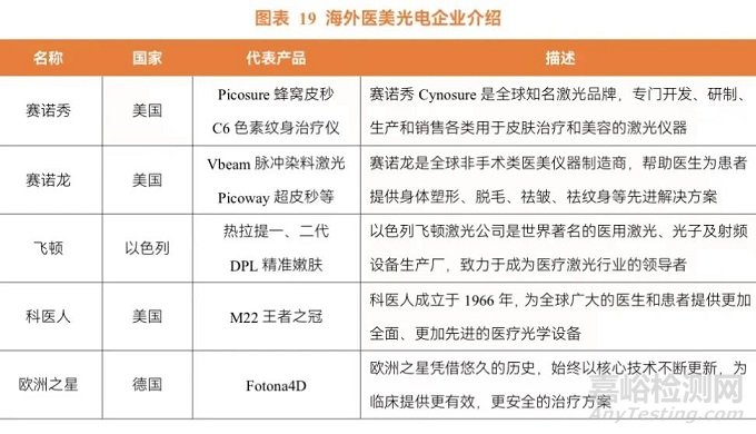 我國醫(yī)美器械起步較晚,目前光電醫(yī)美市場競爭格局由外資主導(dǎo)。國際醫(yī)美器械器械起源于 1960 年代前后,以德國、意大利等歐洲企業(yè)為領(lǐng)頭羊,1990 年前后美國、以色列企業(yè)成立并得到迅猛發(fā)展。全球醫(yī)美光電器械行業(yè)中,美國和以色列在影響力以及技術(shù)層面都占據(jù)了絕對優(yōu)勢。目前國內(nèi)主流的激光設(shè)備廠商有美國賽諾秀(Cynosure)、美國賽諾龍(Candela)、以色列飛頓(Alma)、美國科醫(yī)人(Lumenis)、歐洲之星。在我國,海外企業(yè)進(jìn)入市場較早,具備較高的技術(shù)優(yōu)勢和行業(yè)經(jīng)驗(yàn),主要份額仍舊被國外品牌所占據(jù)。數(shù)據(jù)顯示,外資品牌大約占據(jù) 60%以上的中高端市場,包括公立醫(yī)院以及大型醫(yī)美連鎖機(jī)構(gòu)。