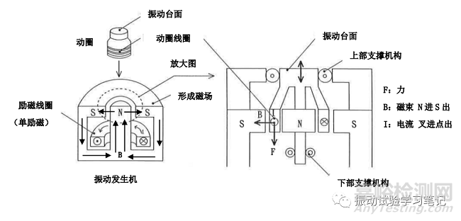 勵(lì)磁線圈內(nèi)流經(jīng)直流電流,形成磁場(chǎng)(下圖中N、S表示)。振動(dòng)臺(tái)面和線圈(動(dòng)圈)加工在一起,安裝在該磁場(chǎng)中,需要注意的是在振動(dòng)試驗(yàn)機(jī)的動(dòng)圈里面通過的是交流電流,受到的力是有正負(fù)之分的。產(chǎn)生上下交變力,發(fā)生振動(dòng),即振動(dòng)臺(tái)面上下振動(dòng)。當(dāng)然,為了保持振動(dòng)臺(tái)面的垂直方向振動(dòng)不偏移,還需要上下支撐機(jī)構(gòu)。具體內(nèi)部構(gòu)造簡(jiǎn)單示意圖如下。