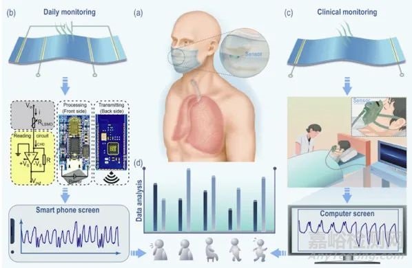諸多可穿電子器件已被開(kāi)發(fā)出來(lái)用于收集人體生理信號(hào),在疾病預(yù)測(cè)和診斷過(guò)程中提供了有用信息。其中,肺部作為人體重要的器官,其狀況可以通過(guò)呼吸參數(shù)所體現(xiàn),用于呼吸監(jiān)測(cè)的傳感器具有重要應(yīng)用意義,所獲取的信息可以為個(gè)人和公共健康提供有價(jià)值的指導(dǎo)意見(jiàn)。盡管先前報(bào)道的方案可以實(shí)時(shí)監(jiān)測(cè)呼吸頻率,但此類傳感器所需的多模態(tài)傳感和對(duì)動(dòng)態(tài)呼吸過(guò)程連續(xù)、長(zhǎng)時(shí)間的監(jiān)測(cè)能力,到目前為止還不成熟。