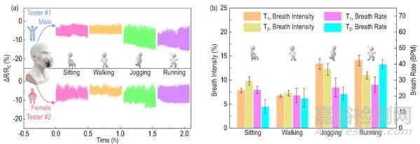 在這項(xiàng)工作中,合作團(tuán)隊(duì)設(shè)計(jì)了一種柔性錳氧化物呼吸傳感器,并將其置于兩種不同的應(yīng)用場(chǎng)景(臨床監(jiān)測(cè)模式和日常監(jiān)測(cè)模式)中進(jìn)行系統(tǒng)的測(cè)試,結(jié)果表明該系統(tǒng)能夠?qū)崟r(shí)、連續(xù)、長(zhǎng)時(shí)間地對(duì)動(dòng)態(tài)呼吸過(guò)程進(jìn)行監(jiān)測(cè),并對(duì)不同測(cè)試者在不同運(yùn)動(dòng)狀態(tài)下的呼吸數(shù)據(jù)進(jìn)行了詳細(xì)分析與討論(如圖2所示)。