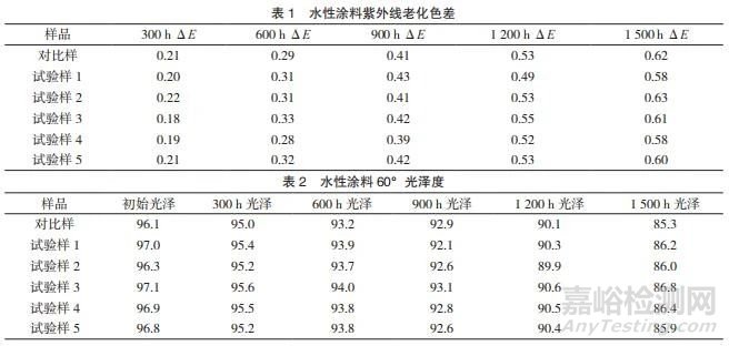 將水性涂料樣板放入紫外光人工老化箱中 300 h、 600 h、900 h、1 200 h、1 500 h,分別測定其色差數(shù)據(jù), 如表 1 所示。由紫外光人工老化箱 300 h、600 h、900 h、 1 200 h、1 500 h 照射后的色差可以看出,本文產(chǎn)品 與對比樣比較,照射每個時間段的色差均要好于對比 樣,特別是 1 500 h 照射后,對比樣的色差遠遠大于 本發(fā)明的產(chǎn)品色差。本文產(chǎn)品完全可以應用于水性涂 料中,并且遠遠好于對比樣。將水性涂料樣板放入紫外光人工老化箱中 300 h、 600 h、900 h、1 200 h、1 500 h,分別測其 60°光澤度, 數(shù)據(jù)如表 2 所示。對比樣初始光澤與本文產(chǎn)品的初始 光澤近似,照射 300 h 后數(shù)據(jù)偏差也不大。照射 600 h 后,本文產(chǎn)品的光澤變化不大,略有降低,而對比樣 降低較多,說明本文產(chǎn)品在光澤度上耐光性要遠遠好 于對比樣,可以用于水性涂料,并且耐光性較好。