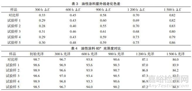 將油性涂料樣板放入紫外光人工老化箱中 300 h、 600 h、900 h、1 200 h、1 500 h,分別測定其色差數(shù)據(jù), 如表 3 所示。由紫外光人工老化箱 300 h、600 h、900 h、 1 200 h、1 500 h 照射后的色差可以看出,本文產(chǎn)品 與對比樣比較,照射每個時間段的色差均要好于對比 樣,特別是 900 h 照射后,對比樣的色差開始明顯大 于本文產(chǎn)品的色差,1 500 h 照射后,本文產(chǎn)品要明 顯優(yōu)越于對比樣。本文產(chǎn)品完全可以用于油性涂料。將油性涂料樣板放入紫外光人工老化箱中 300 h、 600 h、900 h、1 200 h、1 500 h,分別測定其 60°光 澤度,數(shù)據(jù)如表 4 所示。由上述數(shù)據(jù)可以看出,本文 產(chǎn)品制成油性涂料并在紫外光人工老化箱照射后,光 澤度變化不大,即使照射 1 500 h,光澤度變化也不大。而對比樣經(jīng)紫外光照射后,光澤度明顯降低。本文產(chǎn) 品完全適用于油性涂料,并且遠好于對比樣。