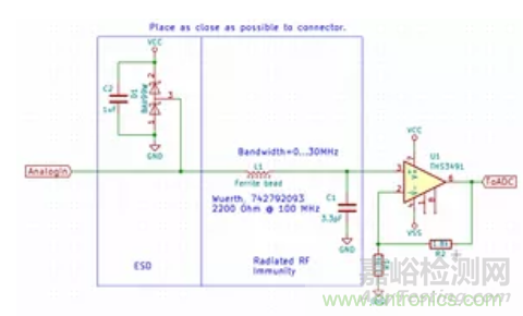差分噪聲濾波器。在下面的示例中,L1和C1充當?shù)屯V波器,從而減小了運算放大器輸入端的外部干擾的影響。