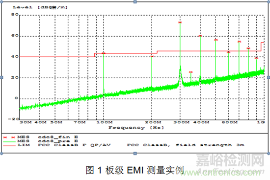 由于兩個(gè)原因,時(shí)鐘信號(hào)常歸咎于 EMI。即使時(shí)鐘低頻率運(yùn)行,較好的時(shí)鐘上升/下降沿也包含大量的奇次諧波,其在更高頻率時(shí)會(huì)引起 EMI。另外,時(shí)鐘通常會(huì)在板上傳播一段較長(zhǎng)的距離,從而更可能給其他組件帶來(lái)干擾。通常,EMI 可通過(guò)頻譜分析儀測(cè)量,如圖 1 所示。圖中,綠色信號(hào)存在一些超出紅色 FCC 屏蔽的頻率分量(300MHz、400MHz 和 500MHz 等)。