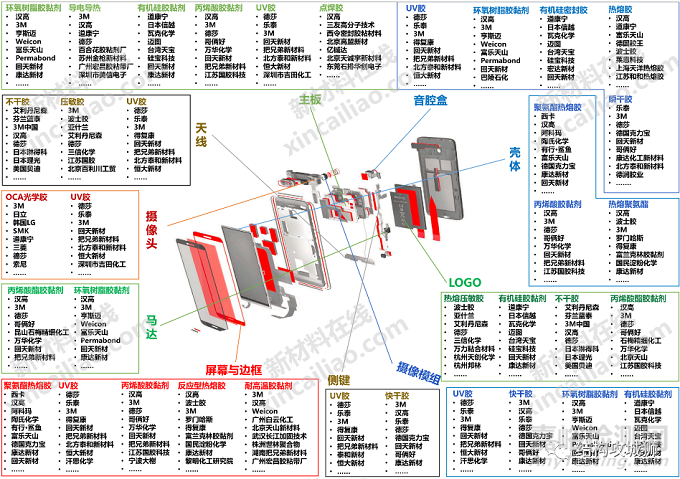 但是在消費電子產品領域,隨著產品形態(tài)越來越小型化,產品的外觀要求越來越高,傳統(tǒng)的固定方式已經不能滿足要求,越來越多的膠粘劑被應用到零件的粘合和裝配中。同時,隨著膠粘劑技術的發(fā)展,金屬與金屬,塑料與塑料,金屬與塑料,都可以實現粘接緊固,還可以使用膠粘劑達到填充、導電、遮蔽、防水、防震等作用,可謂是功能和用途越來越廣泛。