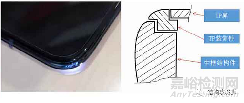 因此,大多數顯示模塊和蓋板使用液體膠水和膠帶將它們粘合到外殼上。比如某手機,TP屏+TP裝飾件+中框,如圖為TP超窄邊的結構示意圖,中框和TP裝飾件及TP裝飾件和TP屏都是通過點膠貼合。