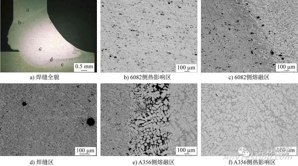 角接接頭微觀組織如圖3所示,焊縫可分為3個區(qū)域,分別是熱影響區(qū)、熔融區(qū)與焊縫。A356鋁合金側(cè)熔融區(qū)為共晶組織,熱影響區(qū)顯微組織與母材相似,均為α- Al基體。