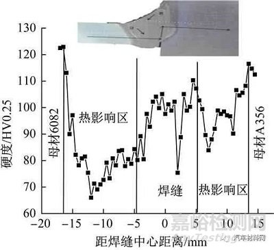 接頭的焊縫、 焊縫兩側(cè)熱影響區(qū)及母材的硬度如圖4所示。其中熱影響區(qū)由于晶界液化硬度較低。