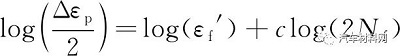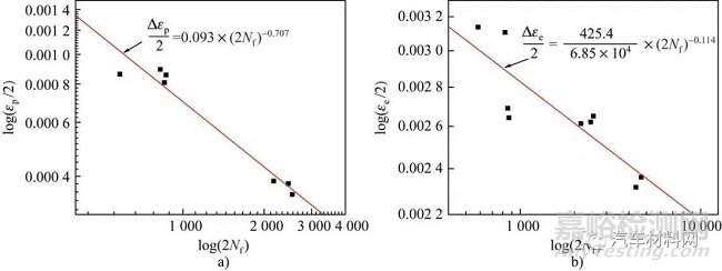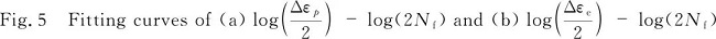 根據(jù)Coffin- Manson- Basquin公式(式(1)、式(2)),對表1中應(yīng)變疲勞數(shù)據(jù)進(jìn)行線性擬合。