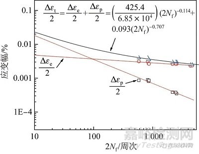 由應(yīng)變- 壽命曲線可見,根據(jù)Manson- Coffin- Basquin[10]方程擬合得到的曲線與真實(shí)數(shù)據(jù)之間的置信度較高,可用來指導(dǎo)材料使用壽命設(shè)計。