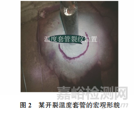 國(guó)內(nèi)某電廠600MW機(jī)組的主蒸汽管道上溫度套管發(fā)生開(kāi)裂,開(kāi)裂溫度套管的宏觀形貌如圖2所示,可見(jiàn)裂紋位于焊縫與母管熔合線附近,主蒸汽母管材料為A335P91鋼,壁厚為47mm;溫度套管材料為1Cr18Ni9Ti鋼,結(jié)構(gòu)形式為溫度套管直接埋入主蒸汽管道中,且為未焊透結(jié)構(gòu)。該溫度套管的結(jié)構(gòu)為直埋式未焊透結(jié)構(gòu),焊縫根部應(yīng)力集中程度較大,焊縫根部坡口角度較小,焊接時(shí)擺絲困難,容易形成夾雜、未熔合缺陷。母管與套管材料不同,為異種鋼焊接,焊接后實(shí)施熱處理的難度較大,在交變應(yīng)力的作用下,沿焊縫與母材側(cè)熔合線產(chǎn)生裂紋,導(dǎo)致溫度套管發(fā)生早期開(kāi)裂。