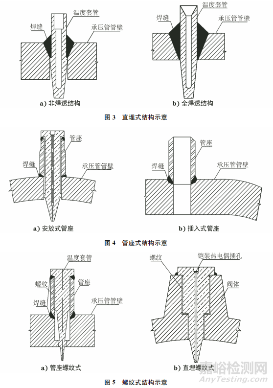 對(duì)于服役溫度大于400℃或服役載荷大于5.9MPa的承壓部件,推薦使用插入式管座;對(duì)于服役溫度小于400℃或服役載荷小于5.9MPa的薄壁承壓部件(壁厚小于20mm),推薦使用直埋式管座。管座角焊縫、溫度測(cè)點(diǎn)、取樣管等與管座的對(duì)接焊縫均須采用全焊透結(jié)構(gòu)。