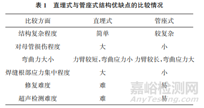 因無(wú)法對(duì)螺紋式結(jié)構(gòu)角焊縫進(jìn)行無(wú)損檢測(cè),故對(duì)管座的質(zhì)量可控性較差,存在安全風(fēng)險(xiǎn),應(yīng)用較少,一般應(yīng)用于高中壓主汽閥上;直埋式和管座式在各類管座中應(yīng)用較廣泛。直埋式與管座式結(jié)構(gòu)優(yōu)缺點(diǎn)的比較情況如表1所示,可見(jiàn)管座式結(jié)構(gòu)焊縫處的應(yīng)力更小,對(duì)主管母材的熱損傷小,易修復(fù),可以對(duì)焊縫埋藏缺陷進(jìn)行超聲檢測(cè),因此在設(shè)計(jì)、改造、維修中應(yīng)首選管座式結(jié)構(gòu)。