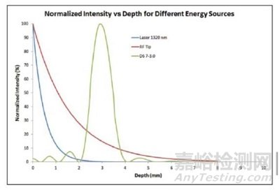 ▲ 超聲在皮膚深層提供峰值能量,射頻、激光在表皮處提供峰值能量 (來源:Aesthetic Surgery Journal,蛋殼研究院)