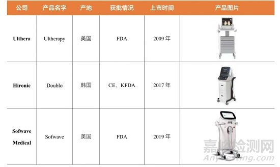 但目前,聚焦超聲產(chǎn)品少,且獲批困難,全球上市產(chǎn)品僅有三款:Ultherapy、Doublo 及 Sofwave。Ultherapy 是最早經(jīng) FDA 獲批應(yīng)用于面部醫(yī)療美容的聚焦超聲產(chǎn)品,也是第一款上市的 MFU 產(chǎn)品,最早獲批應(yīng)用于提拉和收緊眉毛,后獲批應(yīng)用于下頜部,屬于行業(yè)標桿產(chǎn)品。韓國 Hironic 公司推出的 Doublo 整體設(shè)計和美版超聲刀類似,但單次能量要略遜于美版超聲,因此需要多個療程持續(xù)性治療,于 2017 年獲 CE、KFDA 認證。Sofwave 是 FDA 批準的最新緊膚療法,在表層及真皮層的作用更明顯,于 2019 年獲 FDA 批用于減少細紋和皺紋。國內(nèi)尚無上市 MFU 產(chǎn)品,35 億元潛在市場處于虛位待補的狀態(tài)。