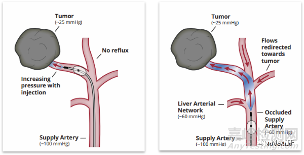 球囊封堵導(dǎo)管TACE(Balloon-occluded TACE,簡稱B-TACE)是一種新型的介入治療方式,該創(chuàng)新原理如下:當(dāng)球囊微導(dǎo)管超選插入腫瘤供血?jiǎng)用}腫瘤末梢分支并將其充盈,相對(duì)于沒有球囊進(jìn)行阻斷動(dòng)脈壓,暫時(shí)性阻斷/封堵的肝動(dòng)脈的球囊微導(dǎo)管尖端壓力(BOASP)就會(huì)明顯降低,在這種情況下,通過肝動(dòng)脈血管造影可觀察到靶向腫瘤區(qū)域更密集的碘油乳劑的積聚,隨著栓塞材料的推注,靶區(qū)內(nèi)的壓力逐漸增加,克服系統(tǒng)循環(huán)的阻力后,實(shí)現(xiàn)更高程度的微血管栓塞劑滲透到腫瘤靶區(qū),同時(shí)還能防止逆行流(反流)進(jìn)入非靶向位置。當(dāng)氣囊被充氣并阻塞肝總動(dòng)脈時(shí),在球囊微導(dǎo)管尖端下游創(chuàng)建了一個(gè)區(qū)域,該區(qū)域的壓力(BOASP)低于系統(tǒng)循環(huán),導(dǎo)致血流減緩并將來自相鄰動(dòng)脈網(wǎng)絡(luò)的血流重新分配到這個(gè)低壓血管區(qū),最終進(jìn)入最低壓的腫瘤組織中。