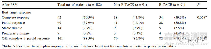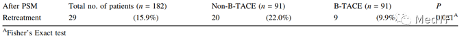 歐洲學(xué)者Golfieri2021年在《Cardiovasc Intervent Radiol》雜志上發(fā)表了相關(guān)臨床內(nèi)容,該研究是封堵球囊導(dǎo)管B-TACE vs 標(biāo)準(zhǔn)微導(dǎo)管Standard Microcatheter的雙臂、多中心研究,一共入組530例患者。研究結(jié)果表明在1-6個(gè)月內(nèi)的完全緩釋率(CR)B-TACE顯著高于非B-TACE(59.3%對(duì) 41.8%,p = 0.026)。接受B-TACE治療的患者在前6個(gè)月內(nèi)的再治療率明顯較低(9.9%對(duì)22.0%,p = 0.041)。