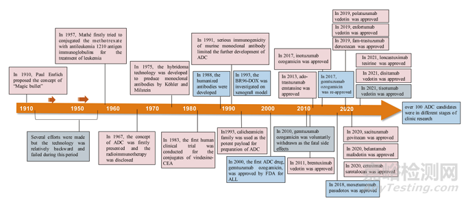 圖1 一個世紀ADC藥物開發(fā)和批準的重要事件的時間表