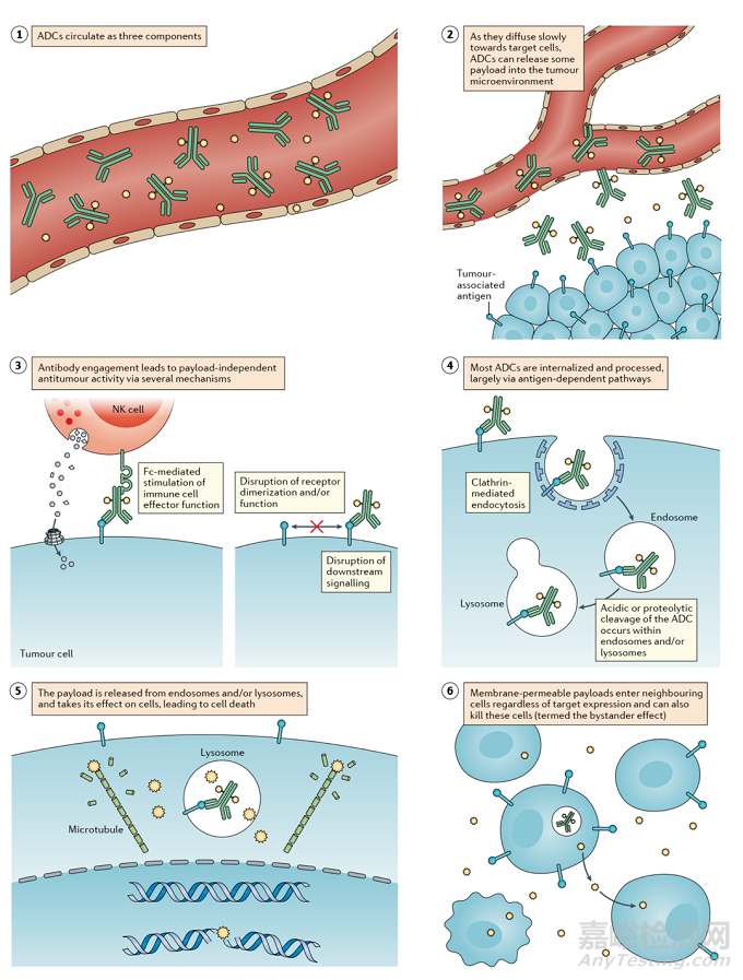 ADC的抗癌活性還涉及ADCC、ADCP和CDC的作用。一些 ADC 的抗體 Fab 片段可以結合病毒感染細胞或腫瘤細胞的抗原表位,而 FC 片段結合殺傷細胞(NK 細胞、巨噬細胞等)表面的 FCR,從而介導直接殺傷效果。此外,ADC的抗體成分可以特異性結合癌細胞的表位抗原,抑制抗原受體的下游信號轉導。