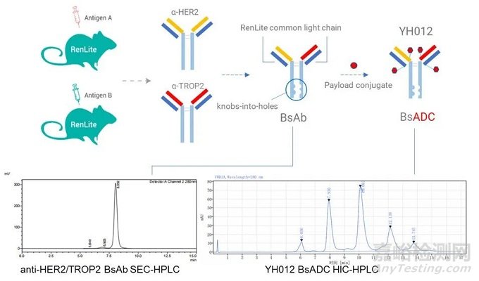 YH012是百奧賽圖利用其RenLite®雙特異抗體平臺上構建的雙靶點ADC(HER2×TROP2),RenLite®利用共同輕鏈的方法防止雙特異抗體輕鏈的錯配,同時采用Knob-In-Hole防止抗體重鏈錯配,可以實現高純度雙特異抗體的生產。在此基礎上,其利用鏈間半胱氨酸進行偶聯(lián),linker為可裂解的二肽VC(valine-citrulline),毒素為MMAE。在NCI-N87腫瘤細胞中,靶向Her2/TROP2的雙抗ADC YH012可以被腫瘤細胞快速內化,并且其內化效率優(yōu)于單靶點的對照ADC藥物。在體內模型中,雙抗ADC YH012可以有效的抑制腫瘤細胞的生長,在療效上優(yōu)于偶聯(lián)相同毒素的單克隆抗體,而且優(yōu)于更高劑量的雙抗裸抗。