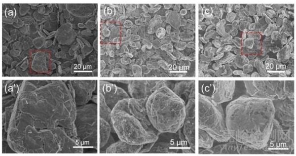 圖1. (a-c)分別為天然石墨(NG)、包覆1 wt% Al2O3的天然石墨(記為AN-1)和包覆3 wt% Al2O3的天然石墨(記為AN-3)的SEM圖像;(a’-c’)為(a-c)中方框區(qū)域的放大圖像。