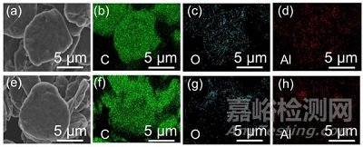 首先,作者通過sol-gel法在天然石墨(NG)表面包覆Al2O3。Sol-gel的制備方法很簡單,先向Al(NO3)3·9H2O中加入去離子水,隨后在攪拌條件下加入天然石墨,最后干燥得到表面包覆Al2O3的天然石墨AN-1 (氧化鋁包覆量1 wt%)和AN-3 (氧化鋁包覆量3 wt%)。NG、AN-1和AN-3的SEM圖像如圖1所示,三者的粒徑分別約11.55 μm、11.58 μm和11.67 μm。從圖1和圖2可以看出,通過sol-gel方法在天然石墨表面包覆的Al2O3是較為均勻的,但天然石墨顆粒并未實(shí)現(xiàn)完整包覆,而是存在相當(dāng)部分的裸露區(qū)域。