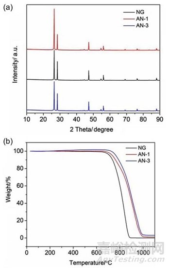 AN-1和AN-3的XRD圖譜同NG幾乎一致,并未顯示出Al2O3的存在,這主要是Al2O3包覆量太少所致。但TGA曲線可以明顯看到900 ℃時(shí)NG燃燒殆盡而AN-1和AN-3依然還存在質(zhì)量,該質(zhì)量同二者的Al2O3量相一致。