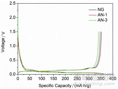 圖4. NG、AN-1和AN-3在0.005-3 V、0.1 C條件下的充放電曲線。
