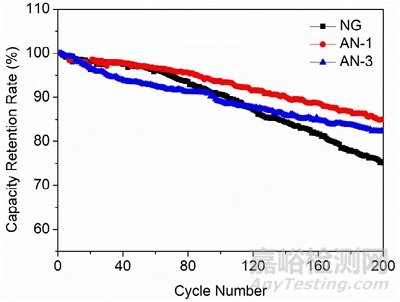 隨后,作者對(duì)NG、AN-1和AN-3的電化學(xué)性能進(jìn)行了對(duì)比分析。首先,從放電容量上看,NG、AN-1和AN-3的放電容量分別為364.0、359.8、350.4 mA/g,庫侖效率分別為93%、93.4%和93.5%。對(duì)于Al2O3包覆降低放電容量,作者認(rèn)為是包覆導(dǎo)致鋰離子擴(kuò)散通道降低所致;而庫倫效率提高則是包覆降低了副反應(yīng)所致(注:再常規(guī)不過的解釋,說不上好也說不上不好!)