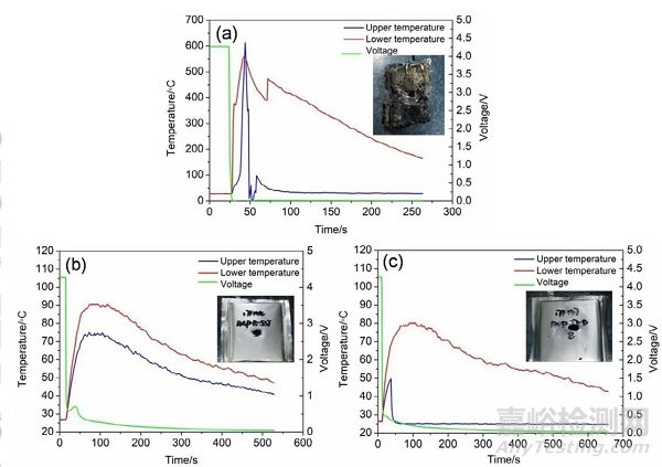圖6. (a)-(c)分別為應(yīng)用NG、AN-1和AN-3三種石墨的2 Ah LCO軟包電池針刺實(shí)驗(yàn)結(jié)果。