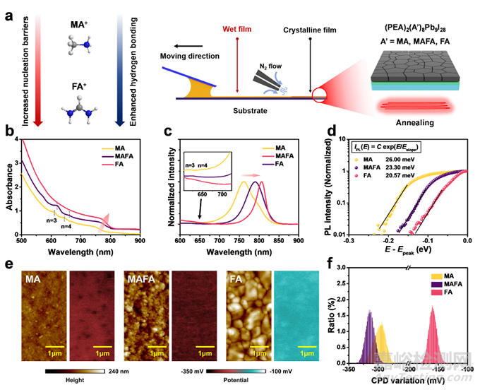 圖1. (a) 基于半月板印刷制備不同體系(PEA2MA8Pb9I28,PEA2MA4FA4Pb9I28和 PEA2FA8Pb9I28)的低維鈣鈦薄膜示意圖,(b) 紫外可見吸收光譜,(c) 熒光光譜,(d) 低能量帶尾的指數(shù)分布,(e) 原子力顯微鏡的高度圖及表面電勢圖,(f) 表面電勢分布統(tǒng)計圖。