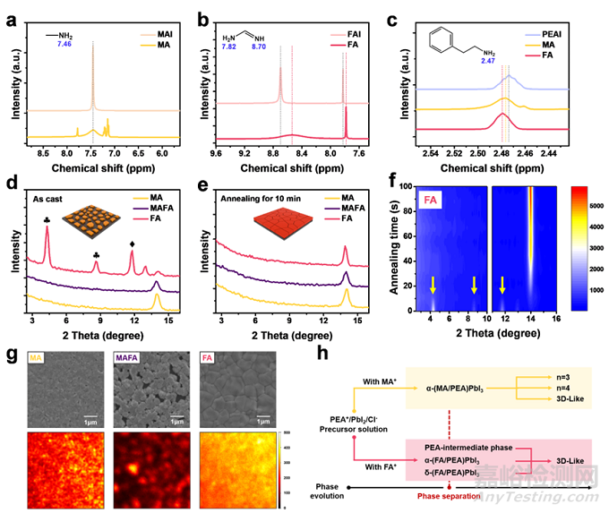 圖2. (a-c) 核磁共振氫譜,(d) 未退火鈣鈦礦薄膜的X射線衍射圖,(e) 退火后鈣鈦礦薄膜的X射線衍射圖,(f) 不同退火時間下的X射線衍射圖,(g) 掃描電子顯微鏡的平面圖和二維熒光圖,(h) 結(jié)晶路線示意圖。