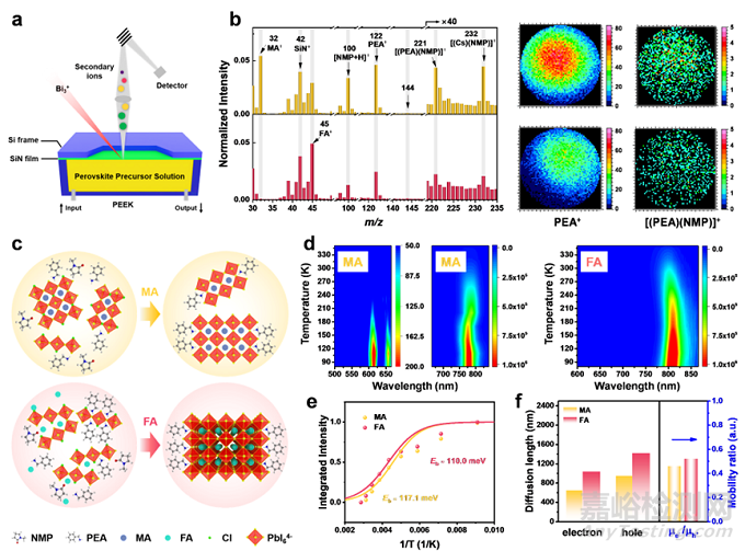 圖3. (a) 原位液體飛行時間二次離子質(zhì)譜測試示意圖,(b) 正離子模式下的飛行時間二次離子質(zhì)譜圖,(c) 結(jié)晶過程示意圖,(d) 變溫?zé)晒鉁y試,(e) 激子束縛能擬合圖,(f) 載流子擴散長度和遷移率統(tǒng)計圖。