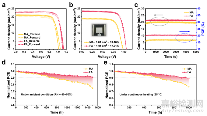 圖4. (a) 正反掃性能測試,(b) 有效面積為1.01 cm2的大面積器件性能測試。(c) 最大功率下的穩(wěn)態(tài)輸出測試,(d) 環(huán)境穩(wěn)定性測試,(e) 熱穩(wěn)定性測試。