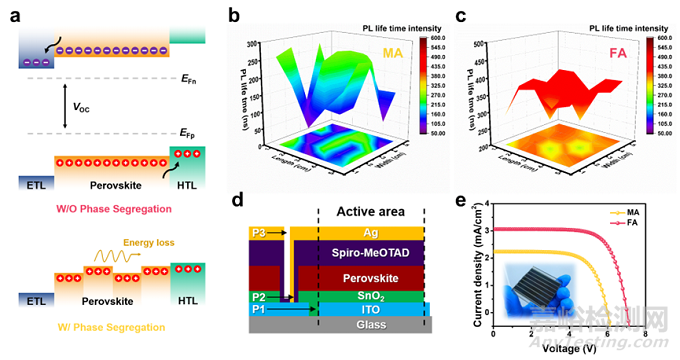圖5. (a) 通過抑制多重量子阱分布從而降低能量損失的示意圖,(b, c) 基于25 cm2襯底的多點位瞬態(tài)熒光壽命統(tǒng)計分布圖,(d) 模組結(jié)構(gòu)示意圖,(e) 模組照片及其光電性能測試。