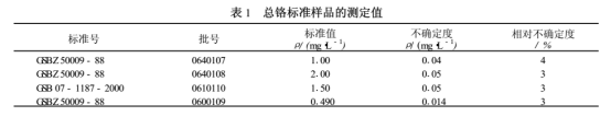 表 1 為總鉻標(biāo)準(zhǔn)樣品的標(biāo)準(zhǔn)值、不確定度和相對不確定度。