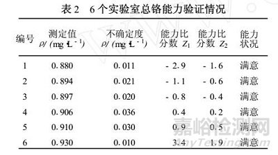 表2為6個實(shí)驗(yàn)室同時測定總鉻的情況,經(jīng)Grubbs檢驗(yàn)無異常數(shù)據(jù)。其中用于能力驗(yàn)證檢測的樣品由上級實(shí)驗(yàn)室采用總鉻標(biāo)準(zhǔn)溶液配制。