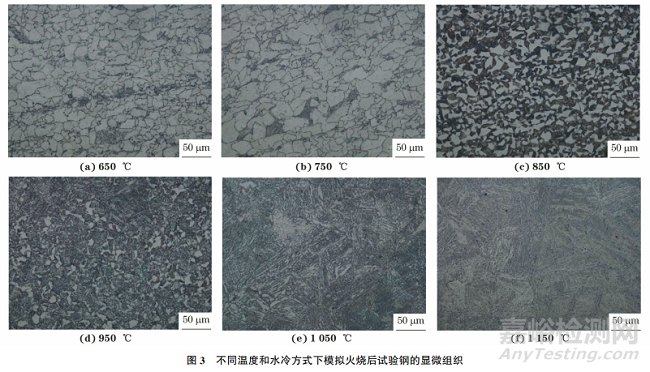 12Cr1MoV鋼的奧氏體相變開始溫度 為776℃,終了溫度為885℃。在850℃及以下溫度保溫時(shí)組織奧氏體化程度低,水冷后組織中未發(fā)生相變的鐵素體含量較高;當(dāng)火燒溫度高于885℃時(shí),3h的保溫時(shí)間不足以實(shí)現(xiàn)完全奧氏體化,組織中仍有少量鐵素體未發(fā)生相變。經(jīng)測(cè)定,在水冷條件下,當(dāng)火燒溫度分別為650,750,850,950,1050,1150℃時(shí),試驗(yàn)鋼中鐵素體的面積分?jǐn)?shù)分別為90%,90%,45%,10%~15%,5%~10%,<5%??梢?,在水冷條件下,當(dāng)火燒溫度高于750℃時(shí),鐵素體含量隨火燒溫度的升高顯著減少,相應(yīng)的馬氏體含量增加。