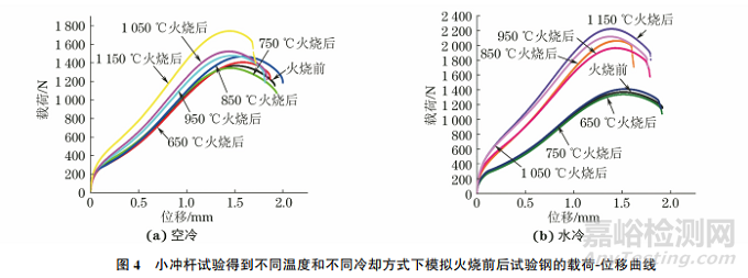 由小沖桿試驗(yàn)得到模擬火燒前后試樣的載荷-位移曲線見圖4,基于最大載荷和最大位移,由經(jīng)驗(yàn)關(guān)聯(lián)公式計(jì)算得到試驗(yàn)鋼的屈服強(qiáng)度和抗拉強(qiáng)度,經(jīng)驗(yàn)關(guān)聯(lián)公式如下: