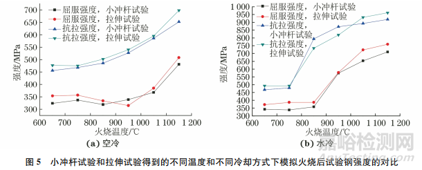 由小沖桿試驗(yàn)和拉伸試驗(yàn)得到原始熱處理態(tài)試驗(yàn)鋼的屈服強(qiáng)度分別為360,356MPa,抗拉強(qiáng)度分別為480,478MPa。由圖5可見,由小沖桿試驗(yàn)和拉伸試驗(yàn)得到的2種冷卻方式下試驗(yàn)鋼的強(qiáng)度隨火燒溫度的變化趨勢(shì)基本一致:當(dāng)火燒溫度不高于750℃時(shí),屈服強(qiáng)度和抗拉強(qiáng)度變化不大,當(dāng)火燒溫度由950℃升高到1150℃時(shí),屈服強(qiáng)度和抗拉強(qiáng)度明顯增大。由小沖桿試驗(yàn)得到的強(qiáng)度與由拉伸試驗(yàn)得到的強(qiáng)度的相對(duì)誤差小于5.0%,驗(yàn)證了小沖桿試驗(yàn)測(cè)定強(qiáng)度的可靠性。