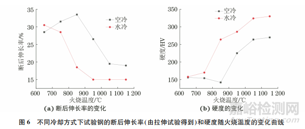 (3)在水冷方式下,當(dāng)火燒溫度不高于750℃時(shí),12Cr1MoV鋼的組織主要為鐵素體、珠光體和碳化物,鐵素體面積分?jǐn)?shù)為90%,強(qiáng)度、斷后伸長(zhǎng)率和硬度隨火燒溫度的變化很小;當(dāng)火燒溫度為850℃時(shí),組織變?yōu)榘鍡l馬氏體和鐵素體,鐵素體面積分?jǐn)?shù)降至45%;當(dāng)火燒溫度在950~1150℃時(shí),組織由板條馬氏體、殘余奧氏體和少量鐵素體組成,隨著火燒溫度升高,鐵素體含量減少(即馬氏體含量增多),強(qiáng)度和硬度顯著提升,斷后伸長(zhǎng)率降低。