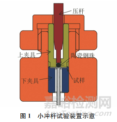 在模擬火燒前后的試樣上截取金相試樣,經(jīng)打磨、拋光,用由體積比為1∶1∶1的HNO3、HCl和H2O組成的混合溶液腐蝕15s后,采用光學(xué)顯微鏡(OM)觀察顯微組織,利用金相檢驗(yàn)軟件測(cè)定顯微組織中珠光體和鐵素體含量。采用電火花方法將試樣加工成直徑為10mm、厚度約為0.7mm 的小圓片,再用砂紙打磨至厚度為(0.5±0.005)mm,采用圖1所示裝置進(jìn)行小沖桿試驗(yàn)。壓桿在傳動(dòng)系統(tǒng)作用下施壓于直徑0.25mm的小鋼珠,使小鋼珠以0.5mm·min-1速度沖壓小圓片試樣,使試樣發(fā)生變形直至破裂。在沖壓過程中,由位移傳感器記錄上下表面位移,力傳感器獲取壓桿載荷,從而獲得載荷-位移曲線。
