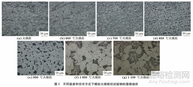 試驗(yàn)材料為12Cr1MoV鋼,試樣表面尺寸為30mm×30mm,熱處理狀態(tài)為1000℃正火+730℃高溫回火。采用馬弗爐將試樣分別加熱至650,750,850,950,1050,1150℃保溫3h,再分別進(jìn)行空冷和水冷,以模擬火災(zāi)現(xiàn)場(chǎng)的火燒過程。