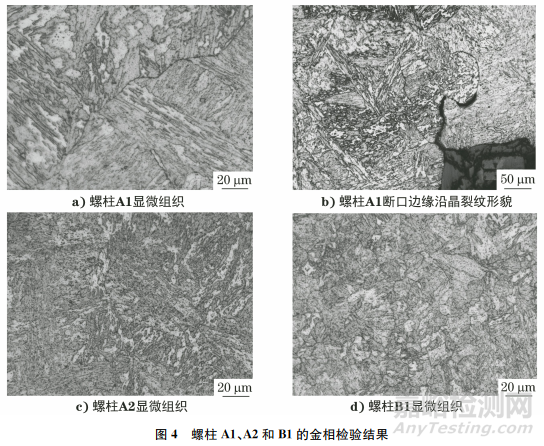 在螺柱A1斷口裂紋源附近的縱截面和橫截面處分別取樣,在螺柱A2和B1的橫截面處取樣,對試樣進(jìn)行金相檢驗(yàn),結(jié)果如圖4所示。由圖4可知:螺柱 A1的顯微組織為貝氏體,有明顯的黑色網(wǎng)狀奧氏體晶界,晶粒粗大,晶粒度等級為1.5級,斷口邊緣裂紋沿晶擴(kuò)展,未發(fā)現(xiàn)明顯的夾雜物或套晶結(jié)構(gòu);螺柱A2的顯微組織為貝氏體,有明顯的黑色網(wǎng)狀奧氏體晶界,晶粒粗大,晶粒度等級為2級,未發(fā)現(xiàn)明顯的夾雜物或套晶結(jié)構(gòu);螺柱B1的顯微組織為貝氏體,有輕微斷續(xù)的網(wǎng)狀奧氏體晶界,晶粒度等級為5級,未發(fā)現(xiàn)明顯的夾雜物或套晶結(jié)構(gòu)。