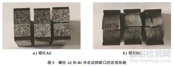 分別在螺柱A1、A2和B1橫截面的1/4半徑處沿軸向切取試樣,并加工成3個(gè)U型缺口沖擊試樣,試樣尺寸為10mm×10mm×55mm(長×寬×高),試樣的缺口深度為2mm,沖擊試驗(yàn)在室溫下進(jìn)行,沖擊試驗(yàn)結(jié)果如表3所示,沖擊試樣斷口的宏觀形貌如圖5所示。由表3和圖5可知:螺柱A1和A2的沖擊吸收能量均低于GB/T 439—2018的要求(≥39J),螺柱A2的剪切斷面率為0;螺柱B1的沖擊吸收能量符合GB/T 439—2018的要求,剪切斷面率為100%。