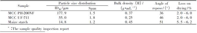 微晶纖維素( microcrystalline cellulose,MCC,CEOLUSTM UF-711,批號: 7981,日本旭化成株式會社) ,微晶纖維素( MCC,Avicel? PH-200NF,批號: M1804C,美國Du Pont Nutrition Biosciences公司) ,玉米淀粉( maize starch,批號:E1922,法國Roquette 公司) 。所選用的輔料性質(zhì)如表1所示。