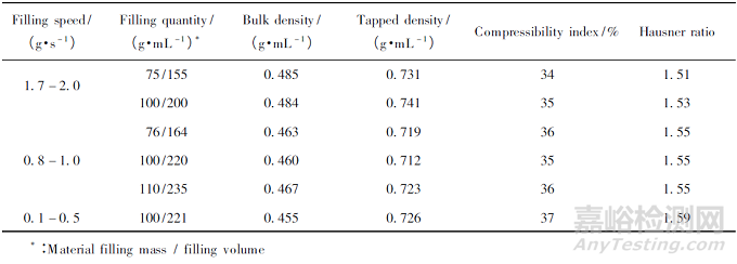 2.3 物料的裝填速度及裝填量對堆密度及壓縮性測定的影響